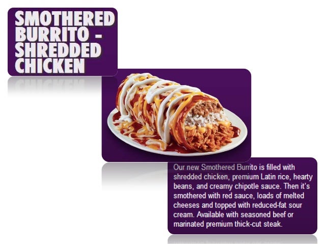 The taco bell menu has all of your favorite mexican inspired foods. Taco bell gently accentuates the fresh, natural flavor of its new burrito by smothering it in red sauce, sour cream, and loads of melted cheeses. Top taco bell smothered beef burito recipes and other great tasting recipes with a healthy slant from sparkrecipes.com. Meat on bottom, then cheese, rice, and beans on top. From classic tacos to burritos to our epic specialties and combos, there's something for everyone on the taco bell menu.